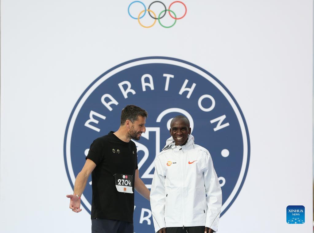 Kenya's Eliud Kipchoge (R) and Paris 2024 President Tony Estanguet pose for photos after the J-1000 Paris 2024 Marathon Pour Tous or Marathon For All, a 5km run along the Champs-Elysees marking the 1000 days countdown to the opening of Paris 2024 Olympic Games, in Paris, France, Oct. 31, 2021. (Xinhua/Gao Jing)