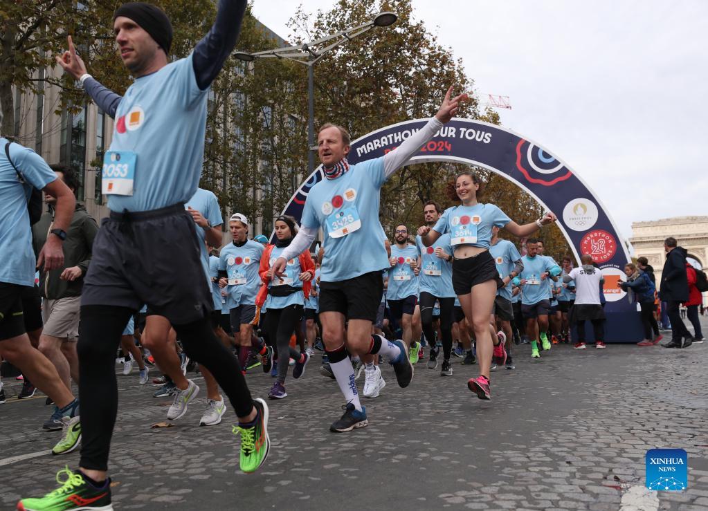 Participants compete during the J-1000 Paris 2024 Marathon Pour Tous or Marathon For All, a 5km run along the Champs-Elysees marking the 1000 days countdown to the opening of Paris 2024 Olympic Games, in Paris, France, Oct. 31, 2021. (Xinhua/Gao Jing)