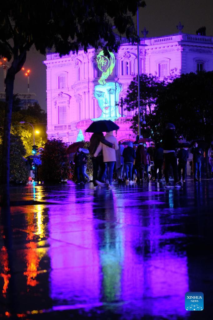 People watch a light show in downtown Madrid, Spain on Oct. 30, 2021. Light shows were staged in Madrid on Oct. 29-31, with artists from Spain, France, Finland and other countries and regions projecting their creative ideas on facades of more than 20 buildings in the city. (Xinhua/Meng Dingbo)