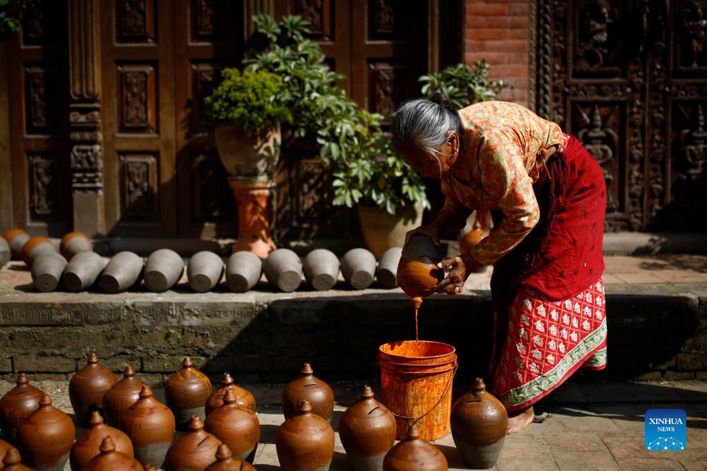 A Nepalese woman prepares clay pots for "Tihar", a Hindu festival, at Pottery Square in Bhaktapur, Nepal on Oct. 31, 2021. (Xinhua/Sulav Shrestha)