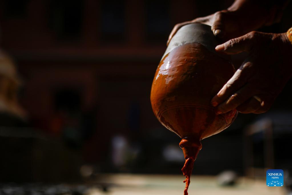 A Nepalese woman prepares a clay pot for "Tihar", a Hindu festival, at Pottery Square in Bhaktapur, Nepal on Oct. 31, 2021. (Xinhua/Sulav Shrestha)