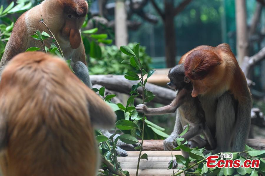 A proboscis monkey baby lives with its family members at Chimelong Safari Park in Guangzhou, south China's Guangdong Province, Oct. 27, 2021.(Photo: China News Service/Chen Jimin)
