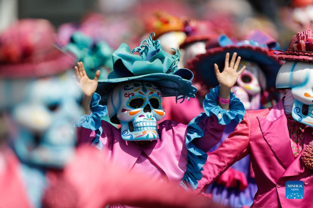 People in ghostly masks and costumes take part in the Day of the Dead Parade in downtown Mexico City, capital of Mexico, on Oct. 31, 2021. (Photo by Francisco Canedo/Xinhua)
