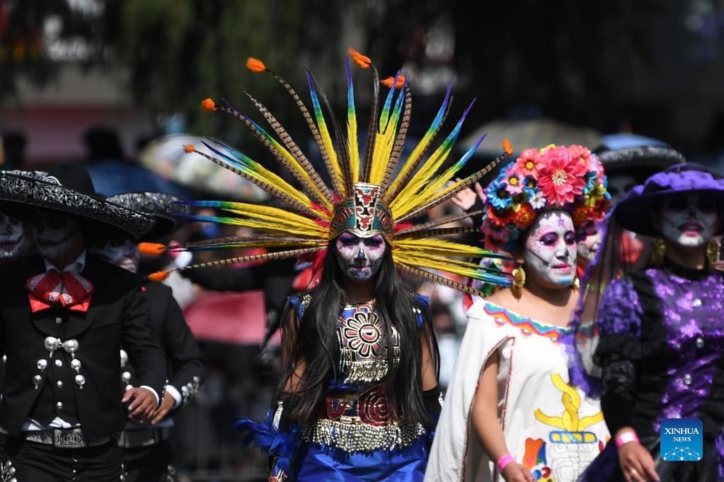 People in ghostly makeup and costumes take part in the Day of the Dead Parade in downtown Mexico City, capital of Mexico, on Oct. 31, 2021. (Xinhua/Xin Yuewei)