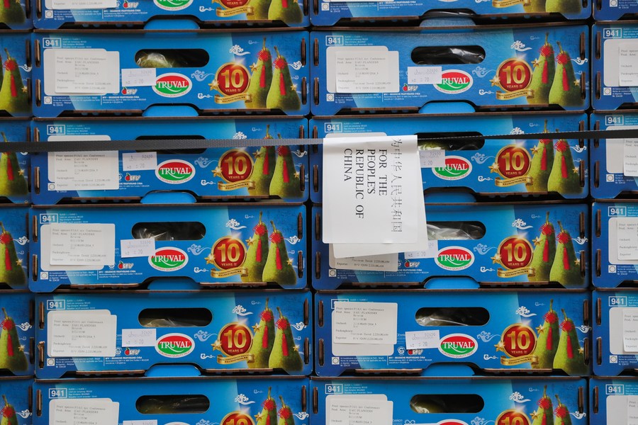 Belgian conference pears to be exported to China are seen at a facility of BFV (Belgian Fruit Valley) in Vrasene, Belgium, Oct. 22, 2021. (Xinhua/Zheng Huansong)
