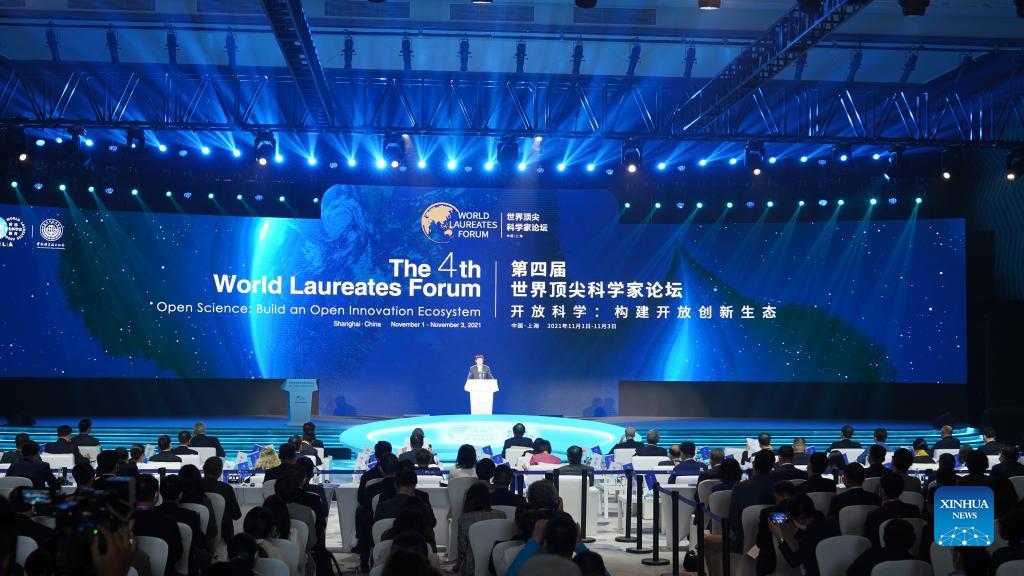 Photo taken on Nov. 1, 2021 shows the opening ceremony of the 4th World Laureates Forum in east China's Shanghai. The 4th World Laureates Forum kicked off Monday in Shanghai, gathering more than 130 decorated scientists, including 68 Nobel Prize winners, to attend the three-day forum. Centering on the theme "Open science: build an open innovation ecosystem," this year's forum will host nearly 100 conferences and activities in 14 sections, covering a number of basic disciplines such as chemistry, physics, life science and mathematics. (Xinhua/Yang Youzong)