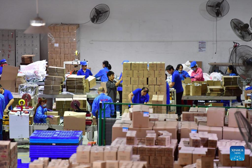 Workers pack Luosifen rice noodles at a food-processing company in Liuzhou, south China's Guangxi Zhuang Autonomous Region, Nov. 1, 2021. Luosifen companies in Liuzhou are working at full capacity to prepare enough stock for the upcoming "Double Eleven" online shopping festival. Liuzhou Luosifen, a soup dish dubbed by some people as "durian of soup" for its strong smell, features rice vermicelli soaked in a spicy broth flavored by river snails and topped with ingredients including pickled bamboo shoots, string beans, peanuts and tofu skin. (Xinhua/Huang Xiaobang)