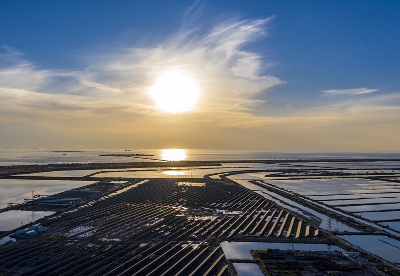 Photo taken on Oct. 19, 2021 shows a photovoltaic power generation project of PetroChina Jidong Oilfield Company under construction in Caofeidian district, Tangshan city, north China’s Hebei province. (People’s Daily Online/ Yang Jun)