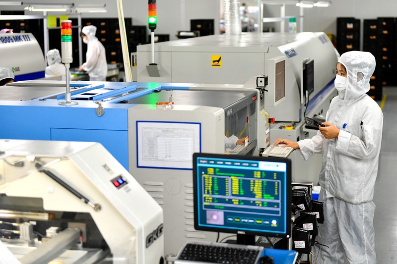 Technicians operate automatic equipment at a factory of HPWINNER, an outdoor high-power LED lights manufacturer located in Changxing Economic and Technological Development Zone, Huzhou city, east China’s Zhejiang province, Oct. 14, 2021. (People’s Daily Online/ Tan Yunfeng)