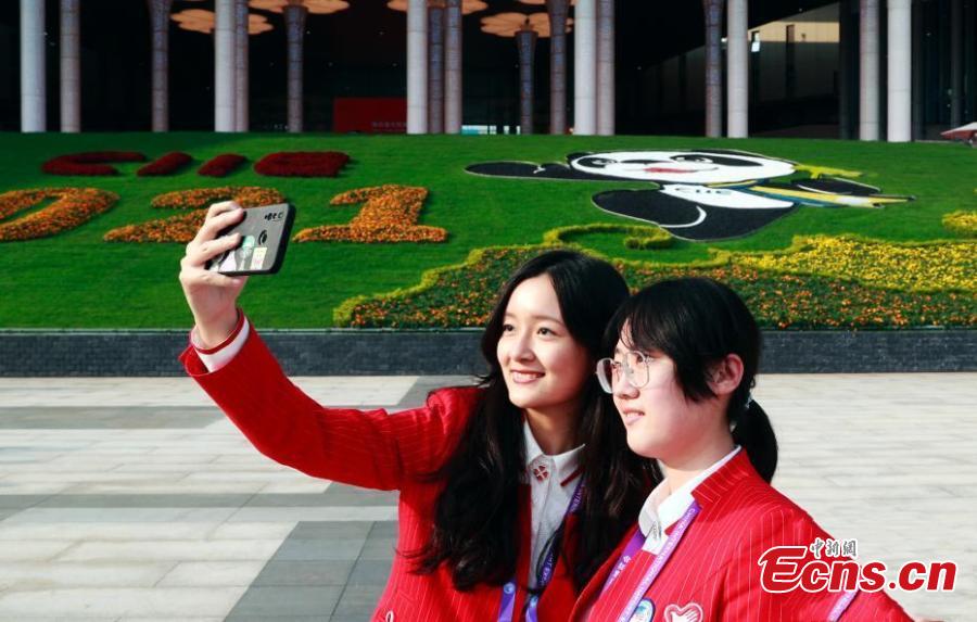 Volunteers selfie outside the CIIE venue in Shanghai, Nov.1, 2021. (Photo: China News Service/Tang Yanjun)