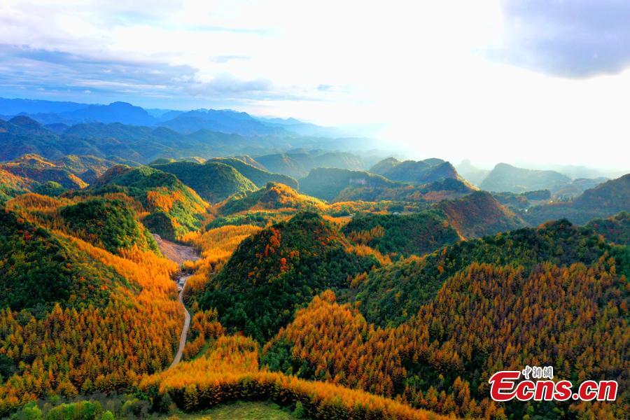 The Yuanyangchi (Mandarin Duck Pond) Forest Park of Zengjiashan is coated with red and golden leaves in Autumn in Guangyuan City, southwest China's Sichuan Province. (Photo: China News Service/Miao Zhiyong)