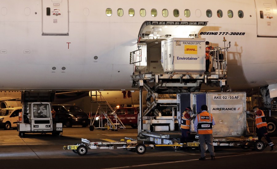Workers transfer the Sinopharm COVID-19 vaccines at the Jorge Chavez International Airport in Lima, Peru, Feb. 7, 2021. (Peruvian Presidential Press/Handout via Xinhua)