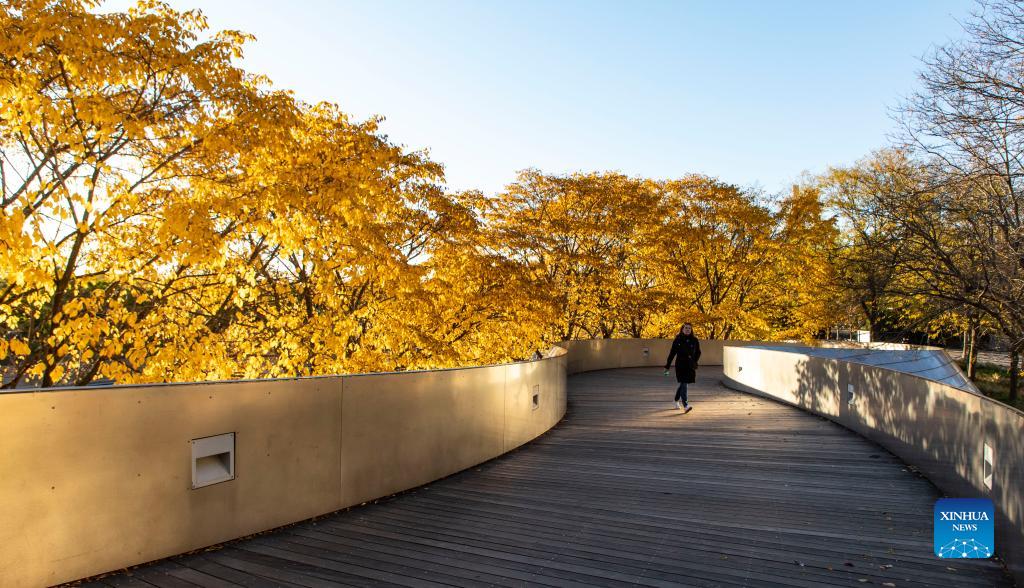A woman walks past trees in the fall colors at Millennium Park in downtown Chicago, the United States, on Nov. 2, 2021. (Photo by Joel Lerner/Xinhua)