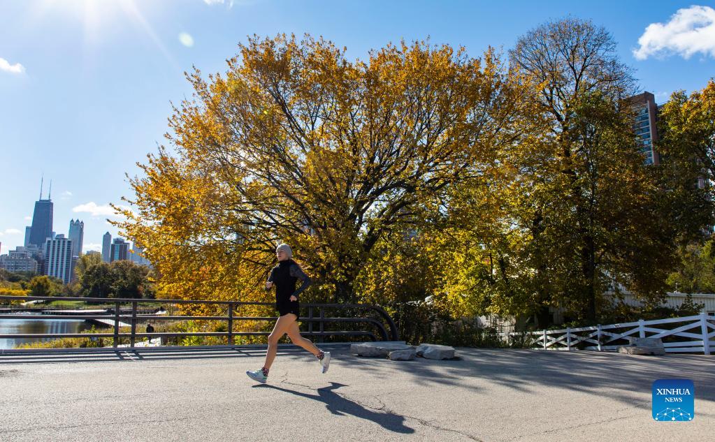 A woman runs at Lincoln Park Zoo surrounded by the fall colors in downtown Chicago, the United States, on Nov. 2, 2021. (Photo by Joel Lerner/Xinhua)