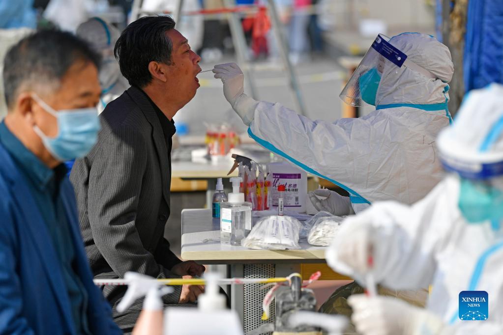 Medical workers take swab samples from citizens at a residential area in Xingqing District of Yinchuan, northwest China's Ningxia Hui Autonomous Region, Nov. 2, 2021. A third round of nucleic acid test has been launched from 8 a.m. Tuesday in Yinchuan. As of Sunday, a total of 33 confirmed COVID-19 cases have been reported in Ningxia, with 21 cases in Yinchuan, the capital city. (Xinhua/Wang Peng)