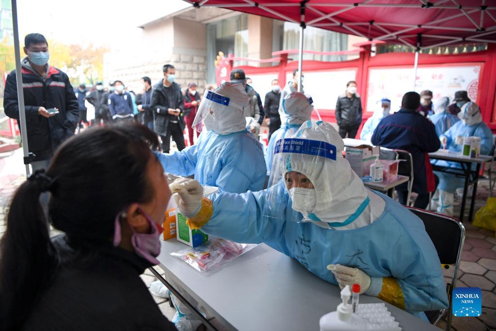 A medical worker takes a swab sample from a resident at a residential area in Xingqing District of Yinchuan, northwest China's Ningxia Hui Autonomous Region, Nov. 2, 2021. A third round of nucleic acid test has been launched from 8 a.m. Tuesday in Yinchuan. As of Sunday, a total of 33 confirmed COVID-19 cases have been reported in Ningxia, with 21 cases in Yinchuan, the capital city. (Xinhua/Feng Kaihua)