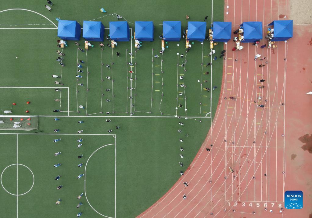 Aerial photo taken on Nov. 2, 2021 shows a COVID-19 testing site in Xining, northwest China's Qinghai Province. Xining has set up 121 testing sites in Chengxi District for massive COVID-19 nucleic acid testing. (Photo by Ma Yirui/Xinhua)