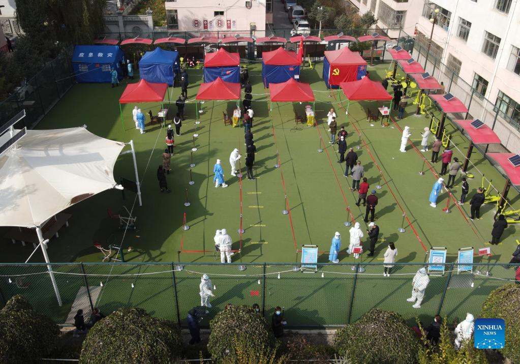 Aerial photo taken on Nov. 2, 2021 shows a COVID-19 testing site in Xining, northwest China's Qinghai Province. Xining has set up 121 testing sites in Chengxi District for massive COVID-19 nucleic acid testing. (Photo by Ma Yirui/Xinhua)