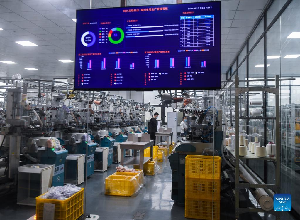Photo taken on Nov. 2, 2021 shows a sock factory equipped with intelligent devices and digitalized system in Zhuji, east China's Zhejiang Province. Local authorities in Zhuji, a major sock manufacturing base, have stepped up diversified financial support to develop sock industry and promote industrial upgrading. (Xinhua/Xu Yu)