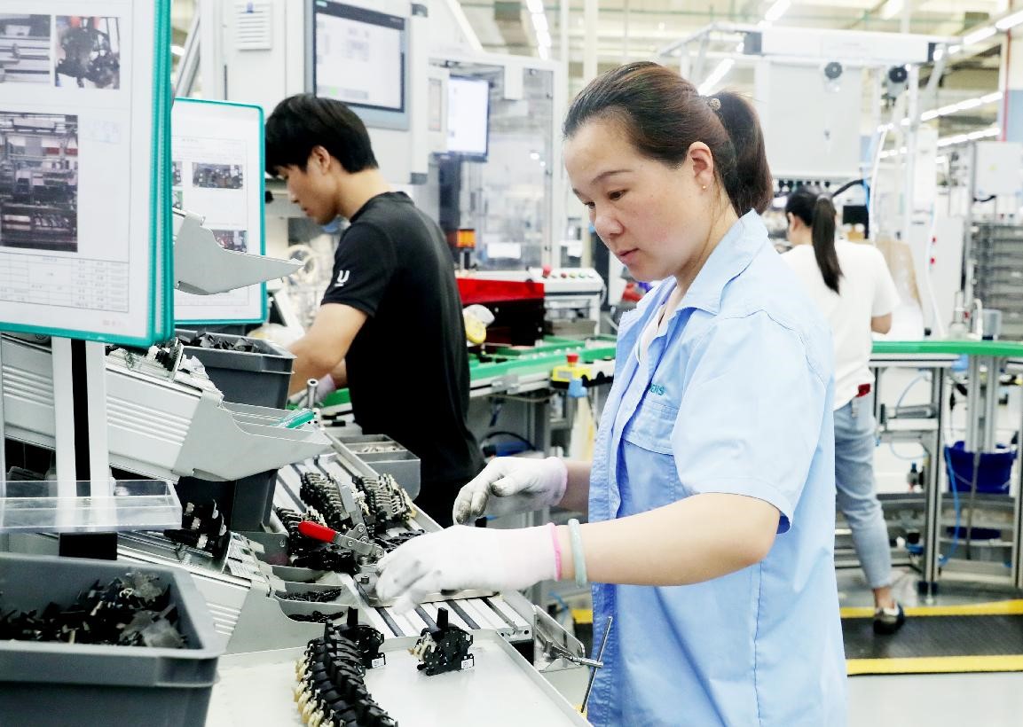 Employees of Siemens Electrical Apparatus Ltd., Suzhou, a subsidiary of Siemens AG based in Suzhou, east China’s Jiangsu province, produce circuit breakers to be exported, June 22, 2021. (People’s Daily Online/Hua Xuegen)
