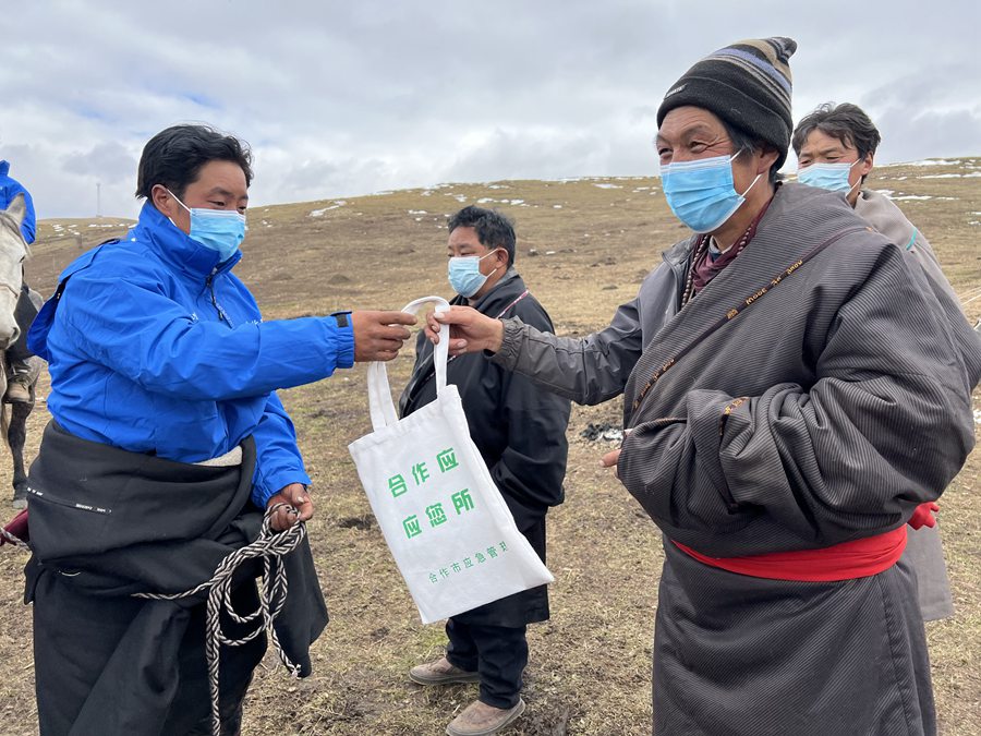 A member of the publicity team gives a bag of anti-epidemic supplies to a herder. (Photo courtesy of the media convergence center of Hezuo city)