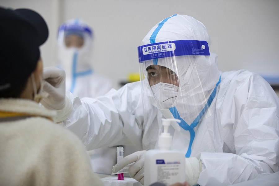 A staff member takes a swab sample from a resident for nucleic acid test at a testing site in Harbin, northeast China's Heilongjiang Province, Oct. 30, 2021. (Xinhua/Zhang Tao)