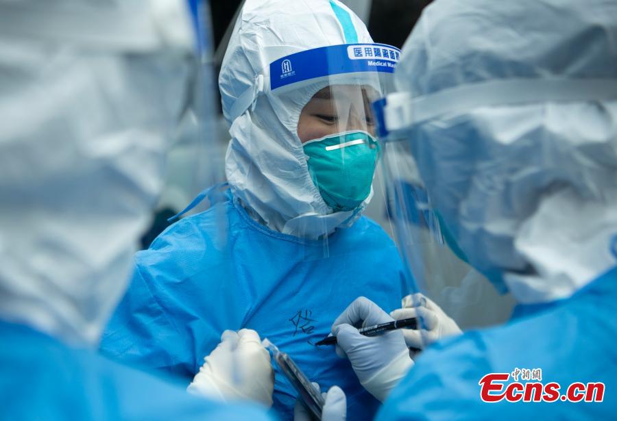 Medical staffs write names and working places before entering the residential community reporting COVID-19 cases in Chengdu, southwest China's Sichuan Province, Nov.2, 2021. (Photo: China News Service/Liu Zhongjun)