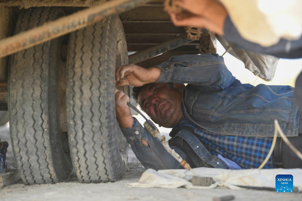Erkin Rehim pumps up tires of his tractor on the way to sell his cotton in Yuli County, northwest China's Xinjiang Uygur Autonomous Region, Oct. 22, 2021. Erkin Rehimc began growing cotton in 2004 and has benefited from agricultural mechanization since 2017. The cotton farmer, 49, uses cotton pickers to harvest his 550 mu (about 90.6 acres) of cotton fields in 24 hours. (Xinhua/Zhao Ge)