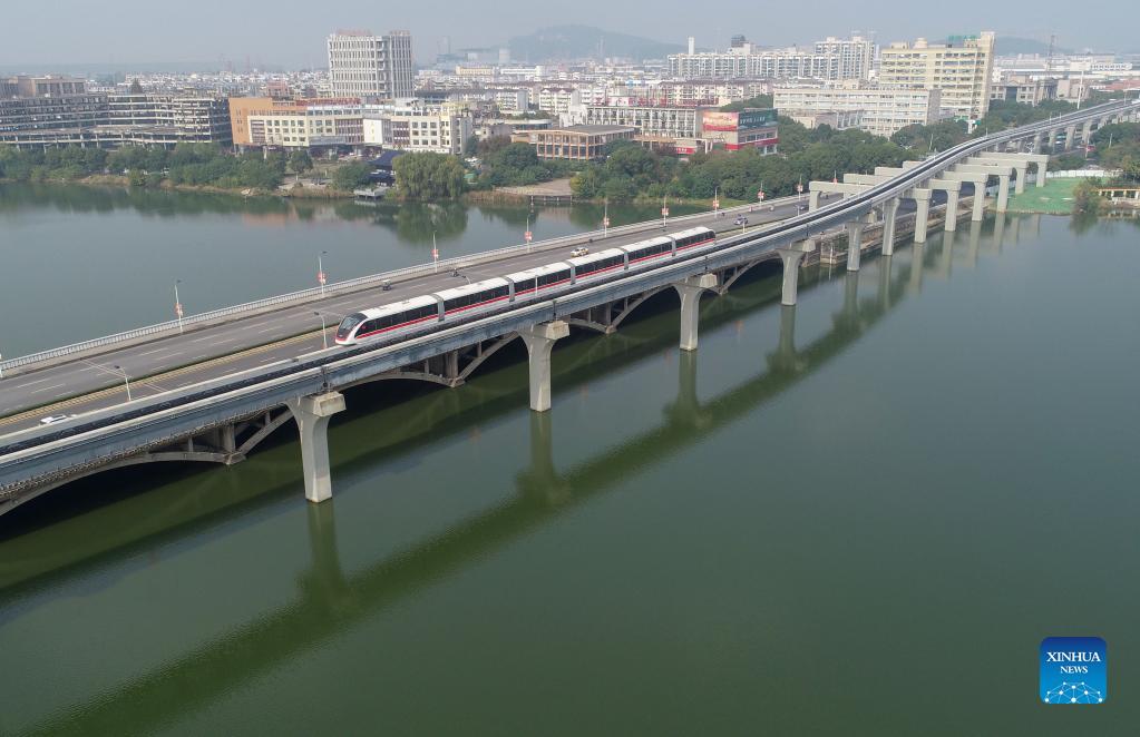 Aerial photo taken on Nov. 3, 2021 shows a self-driving train running on the monorail line 1 in Wuhu City, east China's Anhui Province. The city of Wuhu officially unveiled its first monorail line on Wednesday amid efforts to build a green transportation system in the city. The monorail line 1 operates in a north-south direction covering a total distance of 30.5 kilometers with 25 elevated stations. Trains plying on the line can travel at a speed of up to 80 kilometers per hour. (Xinhua/Cao Li)