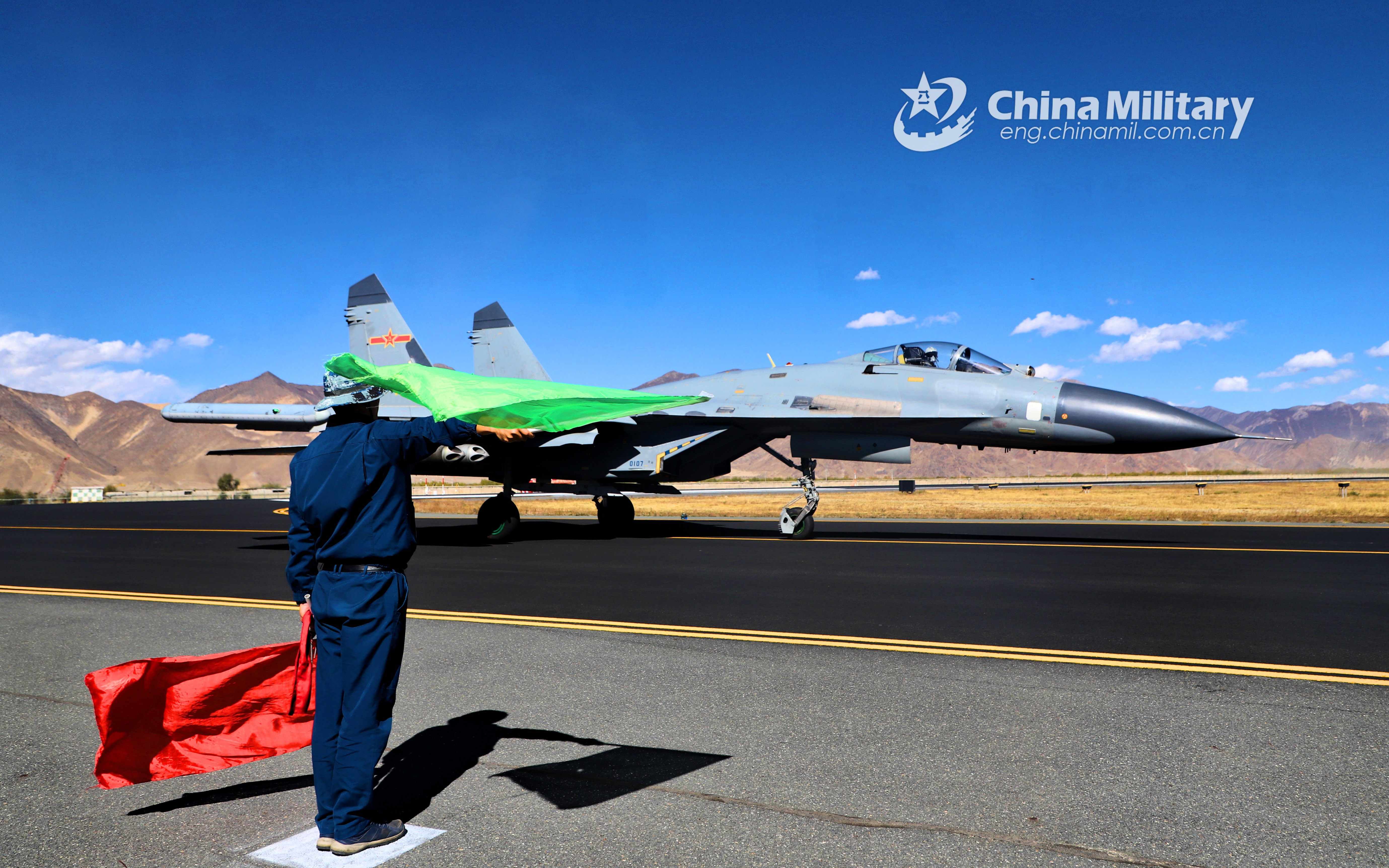 A ground crew member assigned to an aviation brigade of the air force under the PLA Western Theater Command uses flag signals to guide a fighter jet before its taking-off for flight training on October 26, 2021. (eng.chinamil.com.cn/Photo by Wen Rui)