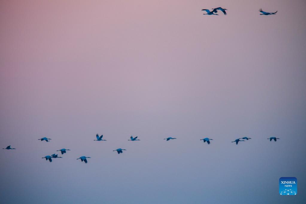 Migrant birds fly over Momoge National Nature Reserve in Zhenlai County, Baicheng City of northeast China's Jilin Province, Nov. 3, 2021. (Xinhua/Zhang Nan)