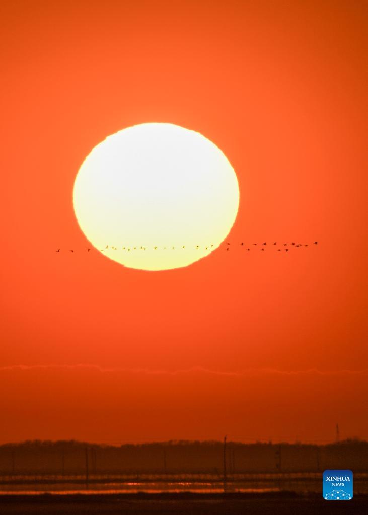 Migrant birds fly over Momoge National Nature Reserve in Zhenlai County, Baicheng City of northeast China's Jilin Province, Nov. 3, 2021. (Xinhua/Zhang Nan)