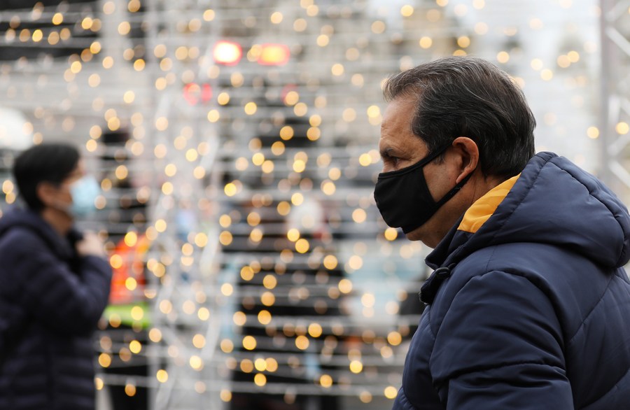People walk past a sign reminding people to wear face masks on a shopping street in Brussels, Belgium, Jan. 22, 2021. (Xinhua/Zhang Cheng)