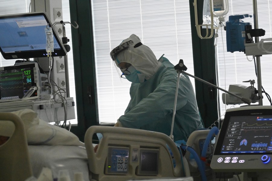A medical staff member works in a COVID-19 unit at a hospital in Bologna, Italy, on March 10, 2021. (Xinhua/Gianni Schicchi)