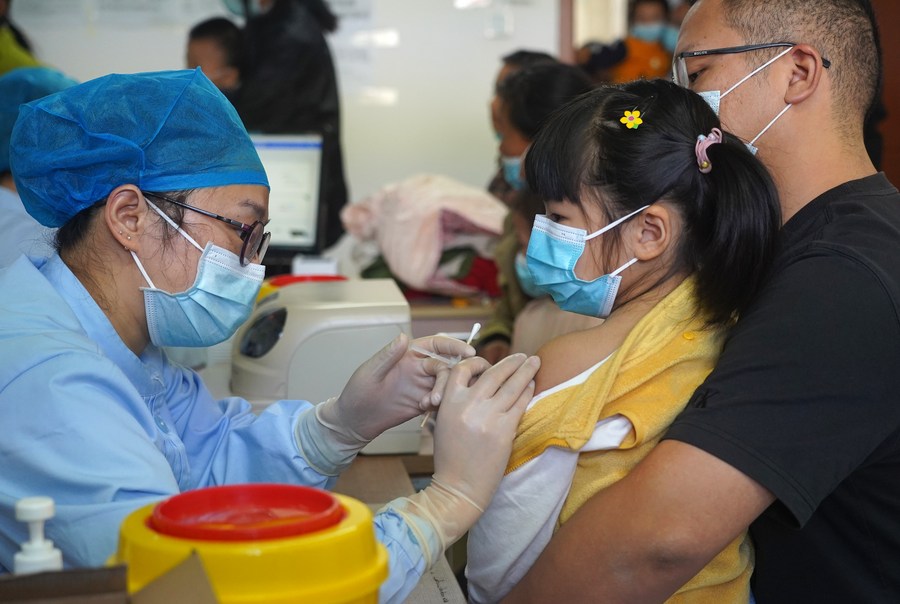 A medical worker administers a dose of COVID-19 vaccine to a child at a hospital in Nanchang, east China's Jiangxi Province, Nov. 3, 2021. (Xinhua/Wan Xiang)