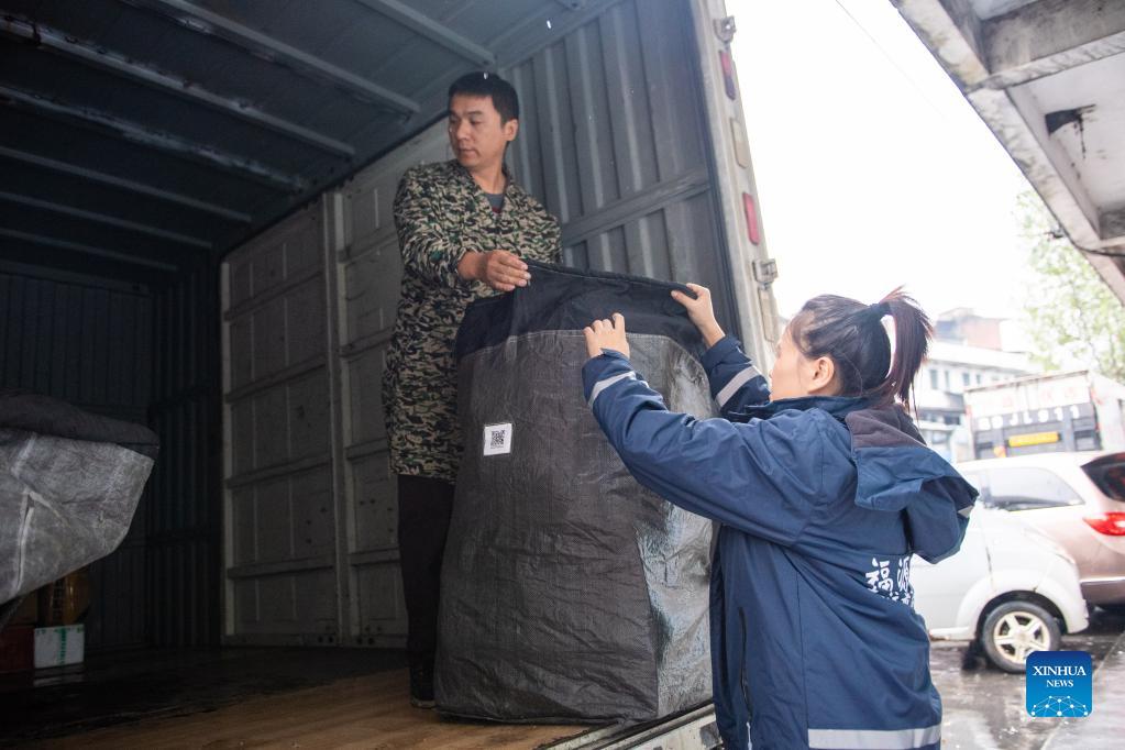 Hu Xia (R) unloads packages in Huangshi Town in Leiyang, central China's Hunan Province, Nov. 3, 2021. Hu Xia is a post-90s deliverywoman providing delivery service for four villages in Huangshi Town. Over the past seven years, the number of local rural delivery orders has increased from less than 10 per day to more than 200 now. In addition to delivering packages, Hu also helps villagers sell bamboo shoots, eggs and other agricultural specialties through online store. Her delivery station has become one of the most lively places in village. In the January-August period, the delivery industry handled over 28 billion parcels in rural areas, a jump of more than 30 percent from a year earlier, according to the State Post Bureau. (Xinhua/Chen Sihan)