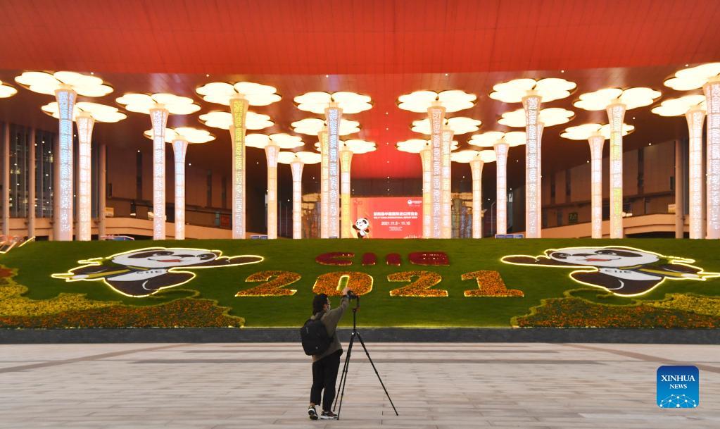 Photo taken on Nov. 3, 2021 shows the National Exhibition and Convention Center (Shanghai), the main venue for the 4th China International Import Expo (CIIE), in east China's Shanghai. The 4th China International Import Expo (CIIE) is scheduled for Shanghai from Nov. 5 to 10. (Xinhua/Hao Jianwei)