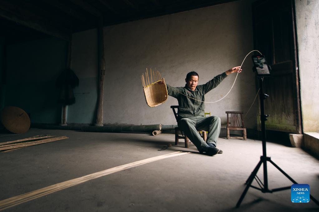 Pan Yunfeng shoots a video of him making a bamboo product at Hengling Village in Lin'an District of Hangzhou, east China's Zhejiang Province, Nov. 2, 2021. A bamboo weaver in Hangzhou has amazed netizens after short videos of him turning thick bamboo into delicate slices were uploaded on social media platforms including TikTok. Pan Yunfeng, 51, makes pot brush, baskets, umbrellas and even bathtubs out of bamboo on TikTok. He started learning bamboo weaving at an early age and began to publish his works in 2019. With over 4.5 million followers on Douyin (the Chinese version of TikTok) and the most popular video garnering about 2 million likes, Pan has become a genuine influencer for netizens by promoting the traditional art simply using his own bare hands. Carrying a history of 2,000 years, bamboo weaving art was listed as a national intangible cultural heritage in 2008. "Bamboo weaving has become an integral part of my life. I will work my best to preserve and pass on the craft," Pan said. (Xinhua/Jiang Han)