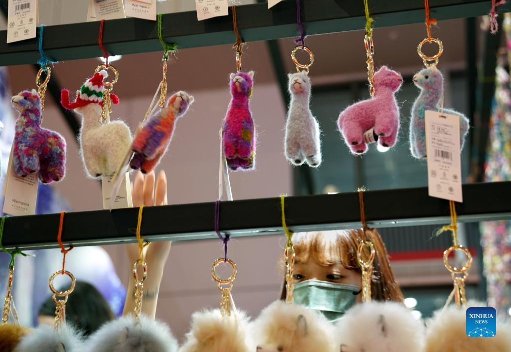 Photo taken on Nov. 6, 2021 shows alpaca-fur stuffed decorations displayed at Ma Yuxia's booth during the 4th China International Import Expo (CIIE) in east China's Shanghai. At the first CIIE, Ma Yuxia, who had worked in South America after graduating from university, introduced the plush alpaca-fur stuffed toys made by Peruvian craftsmen into the Chinese market. Ma and her Peruvian business partner rented a booth of merely nine square meters at the first CIIE to display and promote these toys. Their alpaca dolls were quickly sold out, encouraging Ma and her Peruvian business partner to set up their own brand "Warmpaca." Their brand has now entered shopping malls in many Chinese cities such as Beijing, Shanghai, Guangzhou and Chengdu, and has forged cooperation with three family workshops of about 60 artisans in Peru. At the 4th CIIE, Ma's booth expanded fourfold. Having participated in the CIIE for four consecutive years, Ma and her business partner gained access to the Chinese market with these cute little "alpacas" and other traditional hand-made fluffy dolls. (Xinhua/Liu Ying)
