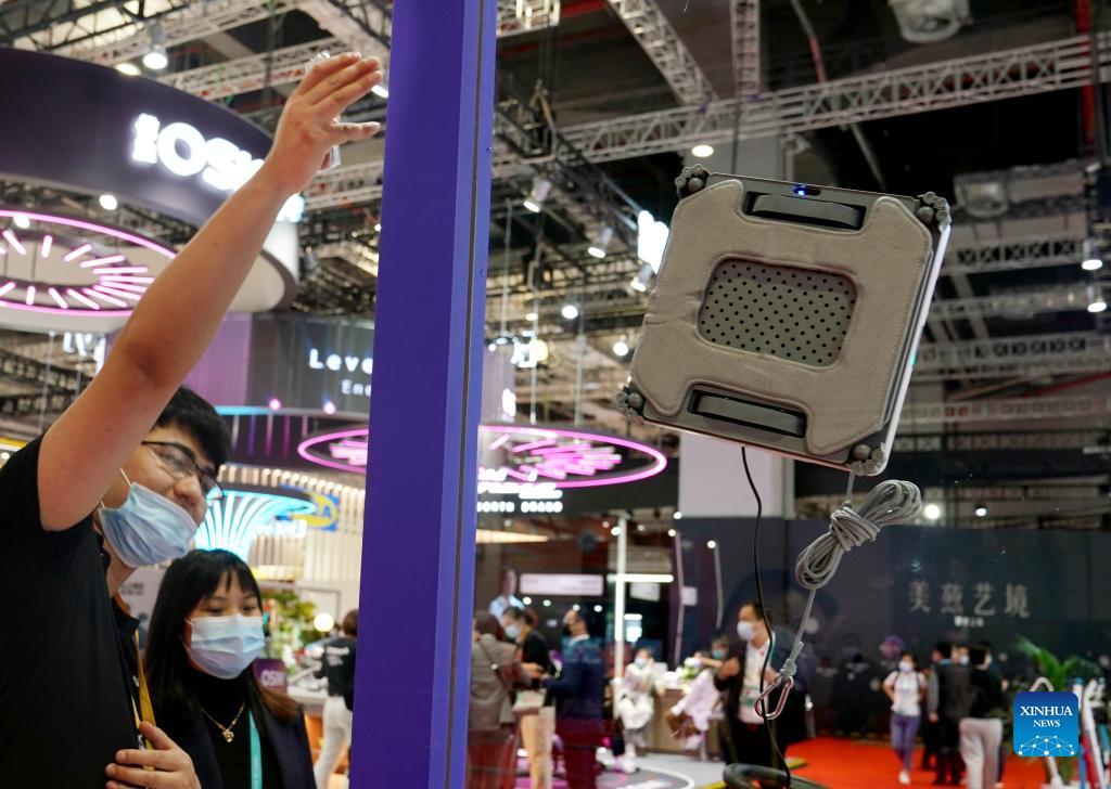 A staff member introduces a window cleaning robot at the Consumer Goods Exhibition Area of the 4th China International Import Expo (CIIE) in east China's Shanghai, Nov. 6, 2021. (Xinhua/Liu Ying)