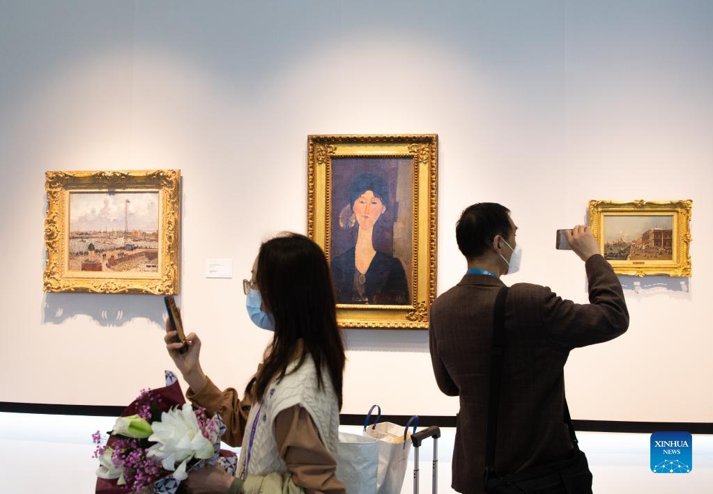 People visit the booth of Christie's during the 4th China International Import Expo (CIIE) in east China's Shanghai, Nov. 7, 2021. The China International Import Expo (CIIE) has for the first time established a cultural relics and art section. Major auction houses made their debuts at the fourth iteration of the expo in the hope of attracting Chinese collectors. The special section has an exhibition area of more than 1,200 square meters and hosts 178 exhibits with a total estimated value of 2.35 billion yuan (about 367 million U.S. dollars). (Xinhua/Wu Huiwo)