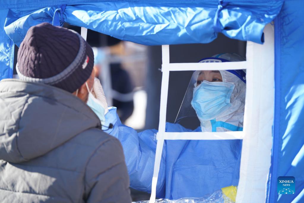 A medical worker takes a swab sample from a resident for nucleic acid testing in Henantun Village of Xingfu Town in Heihe, northeast China's Heilongjiang Province, Nov. 7, 2021. (Xinhua/Wang Song)