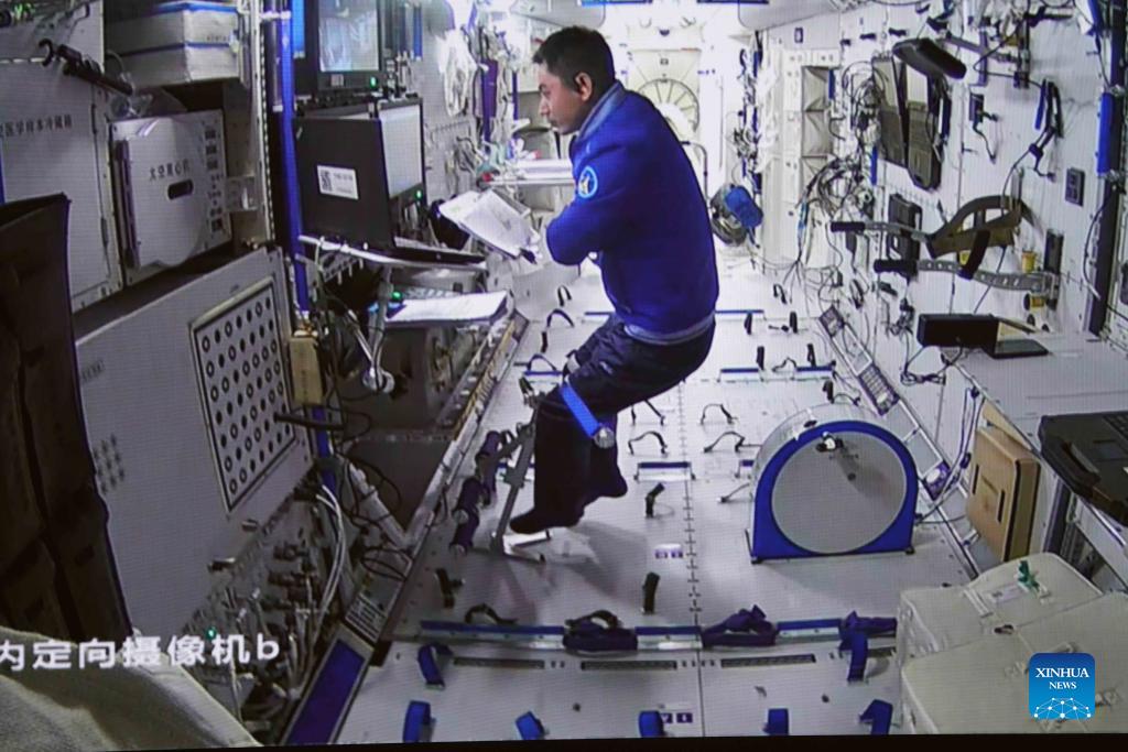 Screen image taken at Beijing Aerospace Control Center on Nov. 7, 2021 shows Chinese taikonaut Ye Guangfu working in the space station core module Tianhe. Taikonauts Zhai Zhigang and Wang Yaping have been out of China's space station core module Tianhe by 8:28 p.m. (Beijing Time) Sunday to start EVAs, the China Manned Space Agency said. Zhai opened the hatch of Tianhe's node cabin at 6:51 p.m. This is the second time Zhai has performed EVAs, having completed China's first spacewalk 13 years ago during the Shenzhou-7 mission. Meanwhile, Wang's EVAs make her the country's first female astronaut to leave footprints in outer space. Donning China-developed new-generation Feitian spacesuits, the pair will conduct a series of extravehicular tasks with the aid of the mechanical arm, the agency noted. Ye Guangfu stayed inside to support his crewmates in completing the operations. (Photo by Guo Zhongzheng/Xinhua)