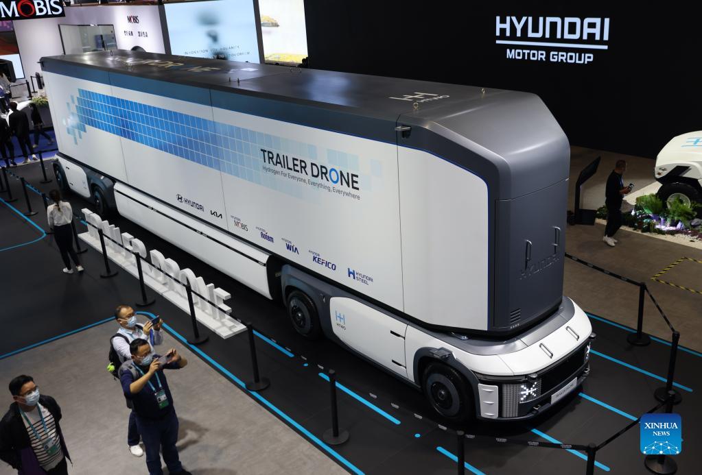 Photo taken on Nov. 7, 2021 shows a Hyundai hydrogen-powered unmanned transport vehicle displayed at the Automobile Exhibition Area of the 4th China International Import Expo (CIIE) in east China's Shanghai. (Xinhua/Hou Dongtao)
