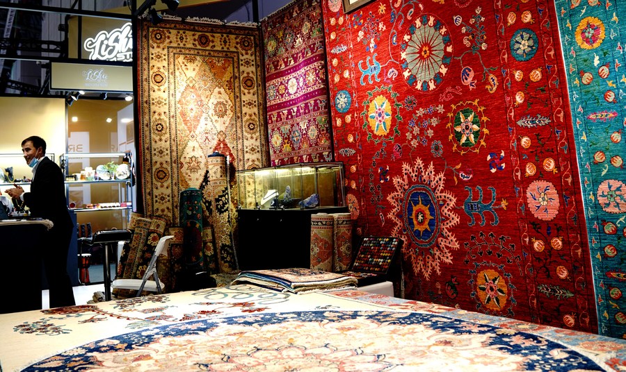 Photo taken on Nov. 6, 2021 shows a booth displaying handmade woolen carpets from Afghanistan during the 4th China International Import Expo (CIIE) in east China's Shanghai. (Xinhua/Zhang Jiansong)