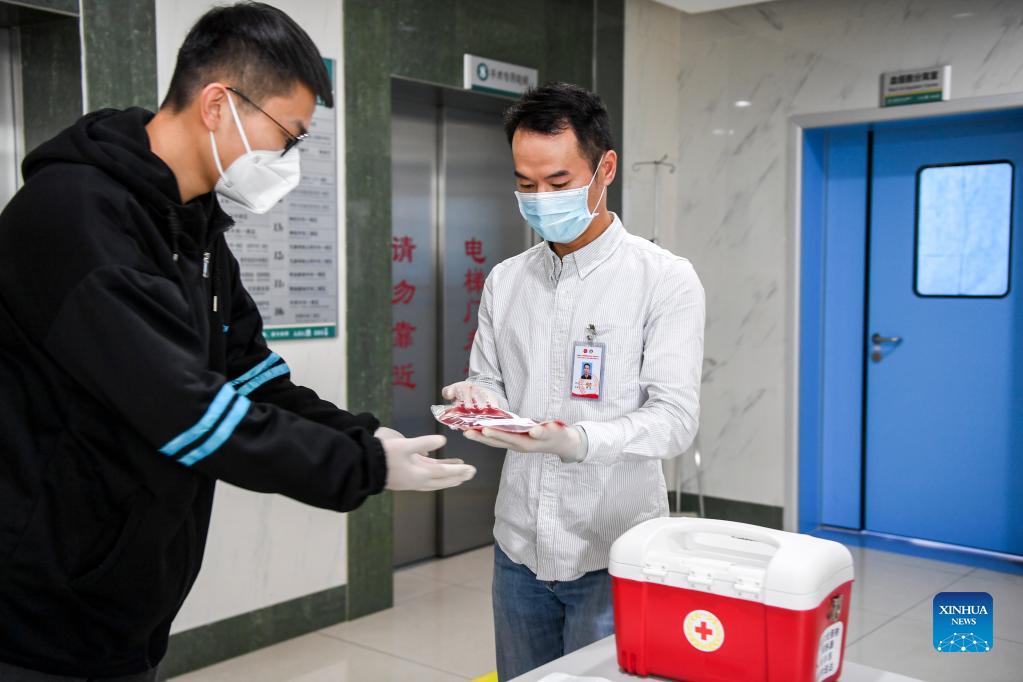 Staff members deliver hematopoietic stem cells collected from doctor Li at the First Affiliated Hospital of Guangxi Medical University in Nanning, south China's Guangxi Zhuang Autonomous Region in November of 2021. Li, a doctor of the hematology department of the First Affiliated Hospital of Guangxi Medical University, registered with China Marrow Donor Program (CMDP) as potential hematopoietic stem cells (HSC) donors in November of 2011. As a doctor providing hematopoietic stem cell treatments for patients, he successfully matches a patient as a HSC donor in August of 2021. Li donated his HSCs recently, which makes him the 12,266th donor of HSC nationally. "It feels good to help someone continue his life," he said. (Xinhua/Cao Yiming)