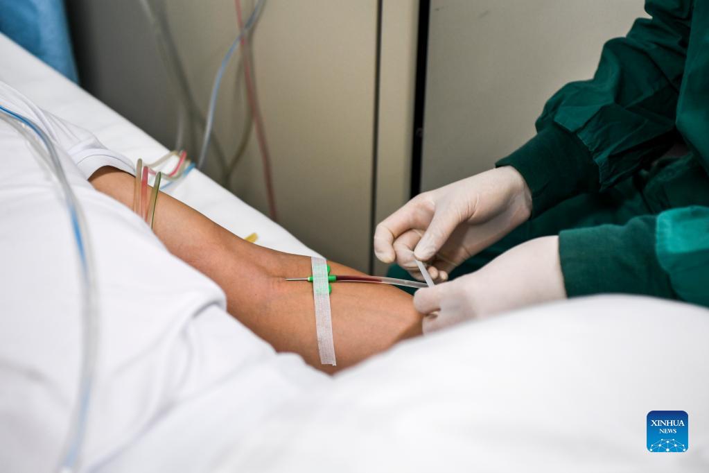A medical worker draws blood from doctor Li at the First Affiliated Hospital of Guangxi Medical University in Nanning, south China's Guangxi Zhuang Autonomous Region in November of 2021. Li, a doctor of the hematology department of the First Affiliated Hospital of Guangxi Medical University, registered with China Marrow Donor Program (CMDP) as potential hematopoietic stem cells (HSC) donors in November of 2011. As a doctor providing hematopoietic stem cell treatments for patients, he successfully matches a patient as a HSC donor in August of 2021. Li donated his HSCs recently, which makes him the 12,266th donor of HSC nationally. "It feels good to help someone continue his life," he said. (Xinhua/Cao Yiming)