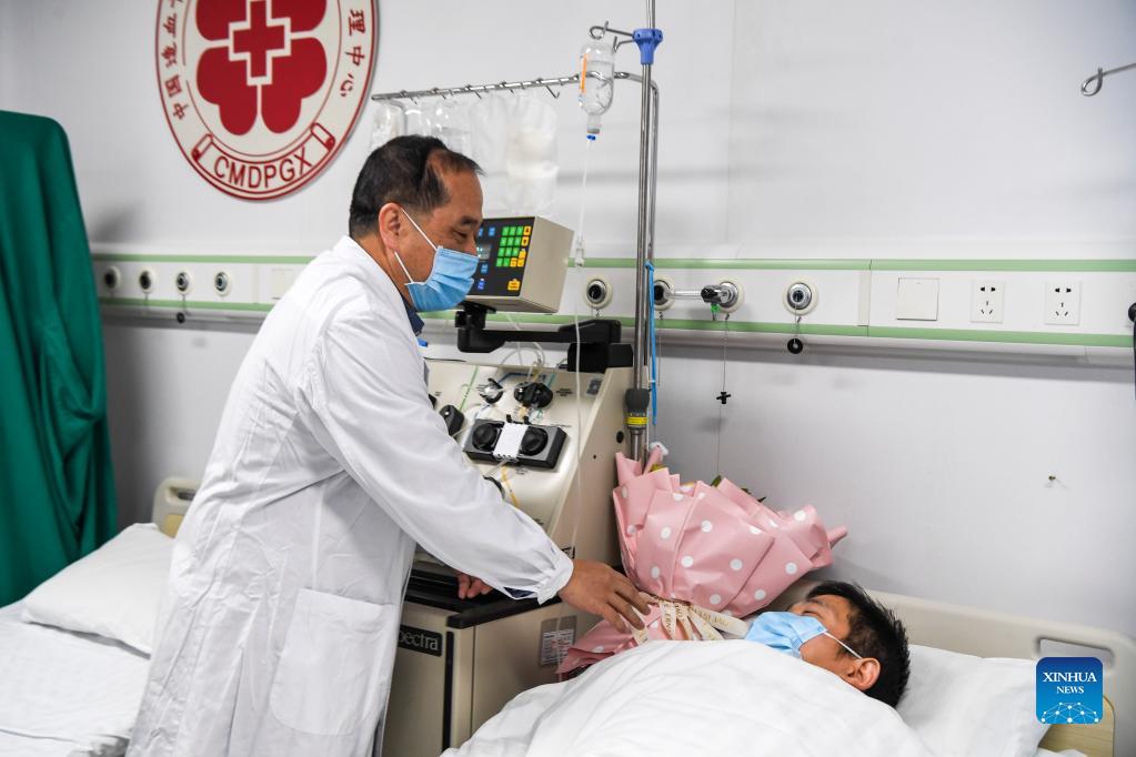 A colleague visits doctor Li at the First Affiliated Hospital of Guangxi Medical University in Nanning, south China's Guangxi Zhuang Autonomous Region in November of 2021. Li, a doctor of the hematology department of the First Affiliated Hospital of Guangxi Medical University, registered with China Marrow Donor Program (CMDP) as potential hematopoietic stem cells (HSC) donors in November of 2011. As a doctor providing hematopoietic stem cell treatments for patients, he successfully matches a patient as a HSC donor in August of 2021. Li donated his HSCs recently, which makes him the 12,266th donor of HSC nationally. "It feels good to help someone continue his life," he said. (Xinhua/Cao Yiming)
