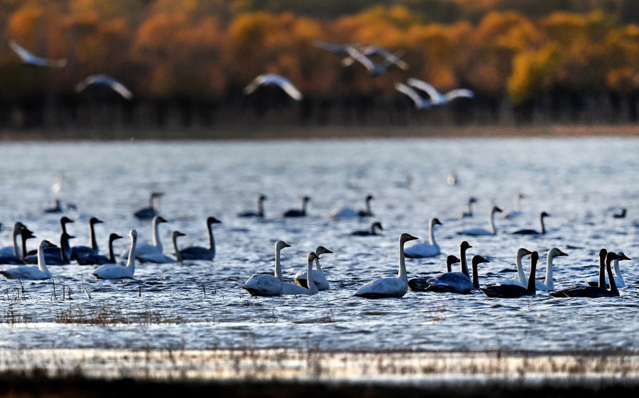 Swans are seen at the Hekou Reservoir wetland in Yulin, northwest China's Shaanxi Province, Oct. 30, 2021. (Xinhua/Tao Ming)