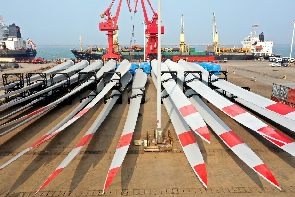Photo taken on Oct. 31, 2021 shows vanes of wind turbines to be shipped overseas from a wharf of Lianyungang Port in Lianyungang city, east China’s Jiangsu province, (People’s Daily Online/Wang Chun)